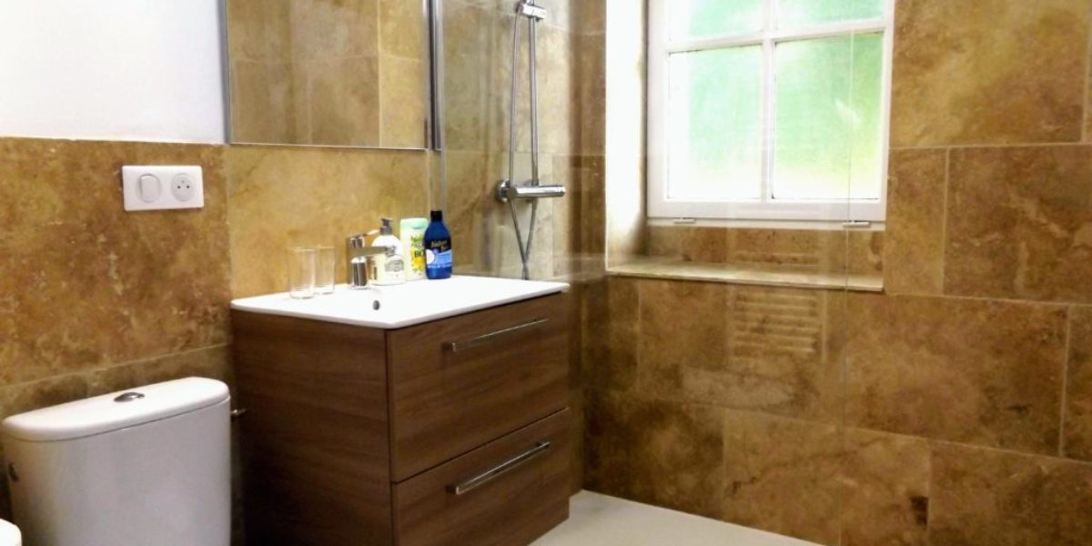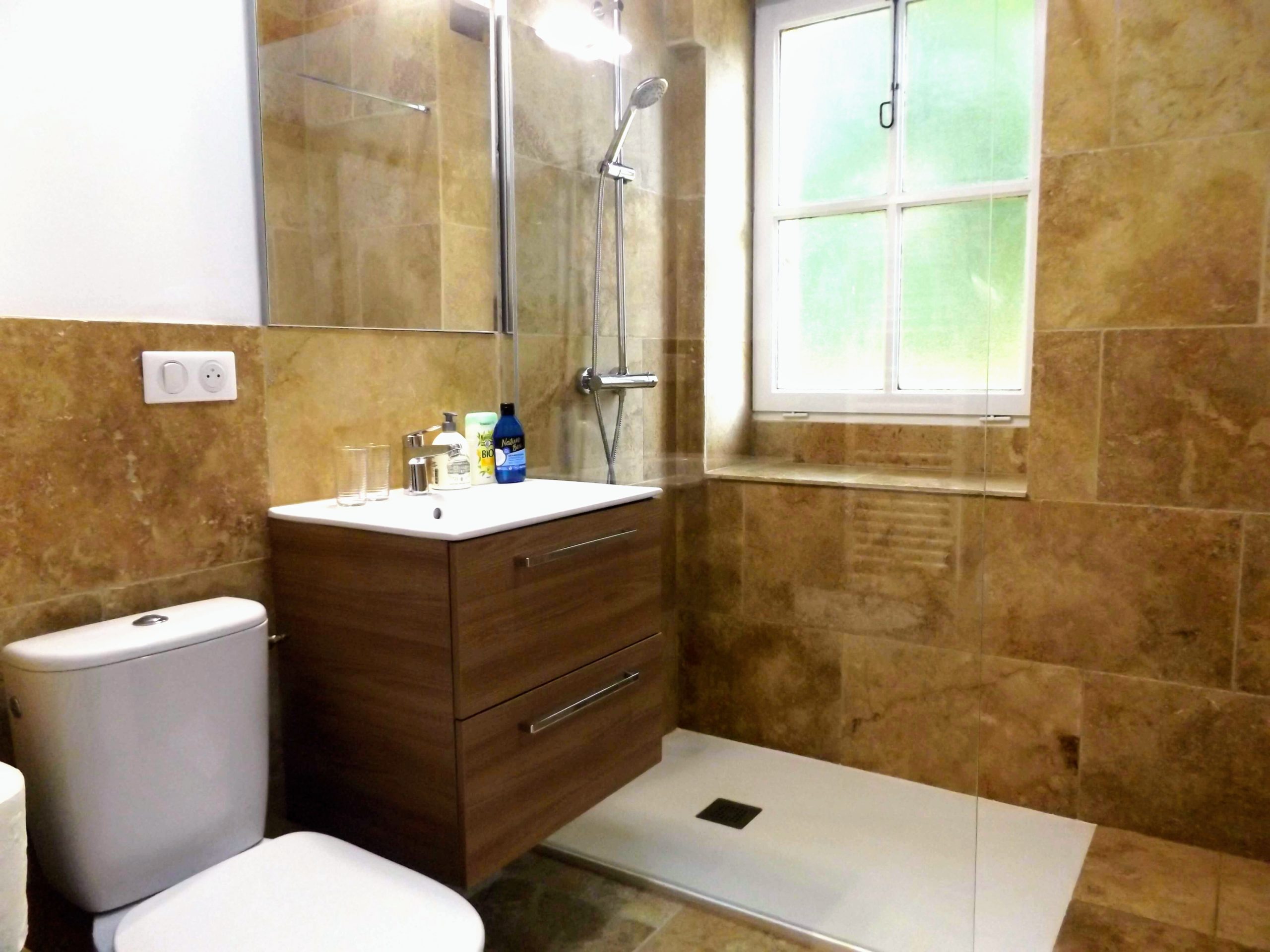 Full of charm with exposed stone walls and Italian walk-in shower.